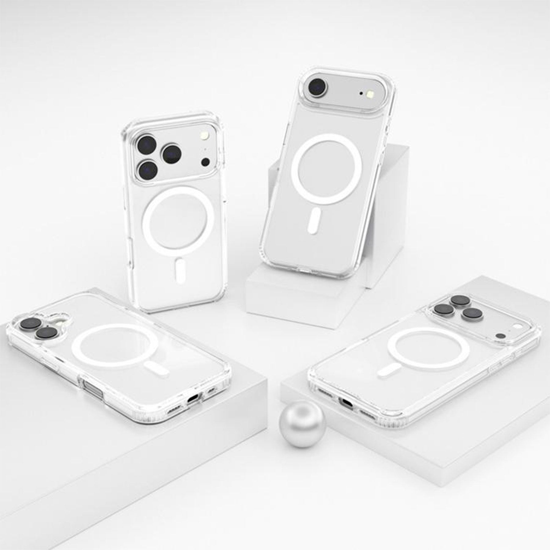 Estuche Magnético transparente con MagSafe y los bordes superior e inferior del marco de TPU se elevan 0,4 mm por encima de la parte posterior de la pc (policarbonato) para que no se raye cuando se coloca el teléfono boca arriba.