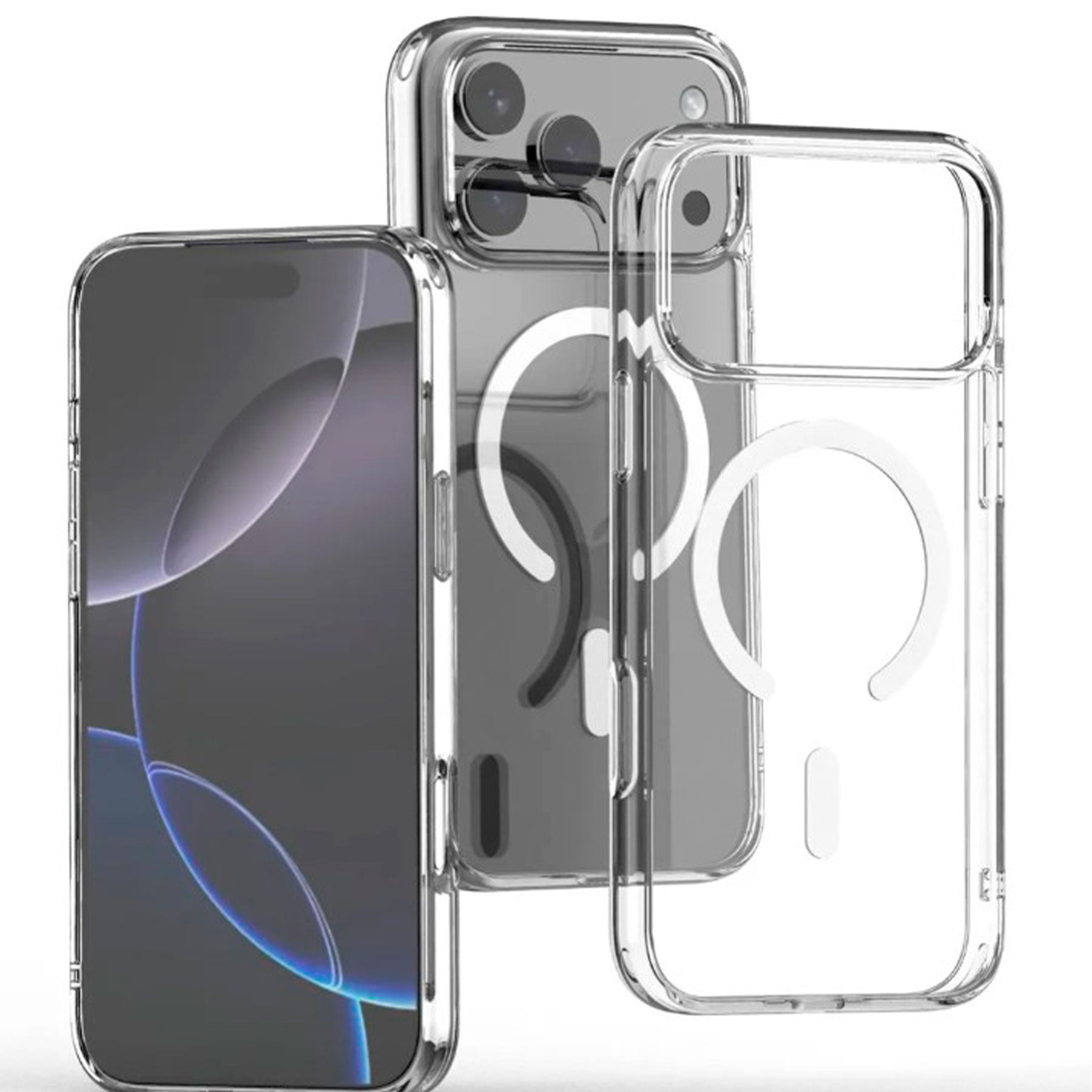 Estuche Magnético transparente con MagSafe y los bordes superior e inferior del marco de TPU se elevan 0,4 mm por encima de la parte posterior de la pc (policarbonato) para que no se raye cuando se coloca el teléfono boca arriba.