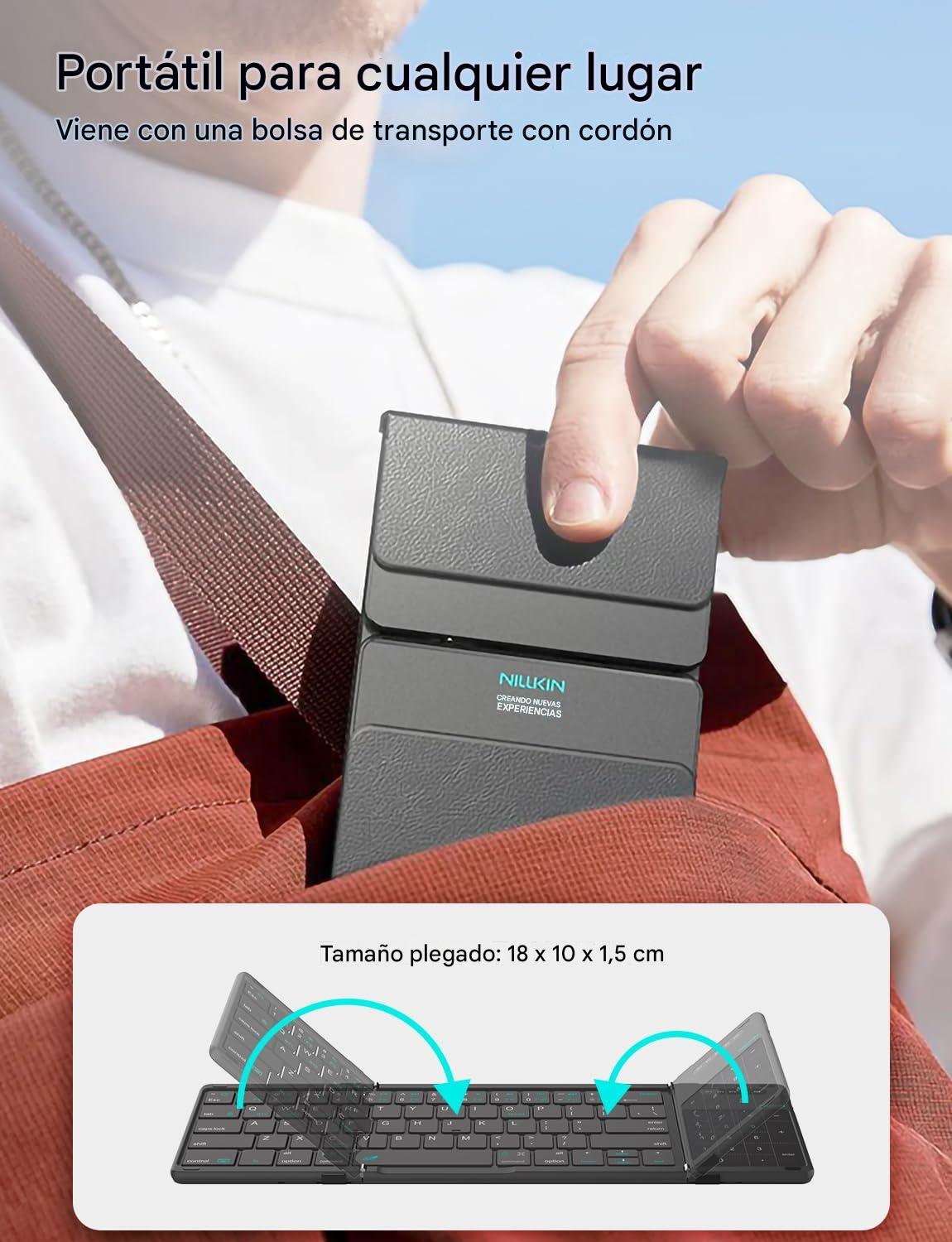 Teclado inalámbrico plegable de tamaño completo.Enciéndelo y conéctalo. Este teclado plegable te permite empacar lo ligero y lo pequeño que necesites, pero obtén un teclado de tamaño casi completo cuando necesites trabajar
